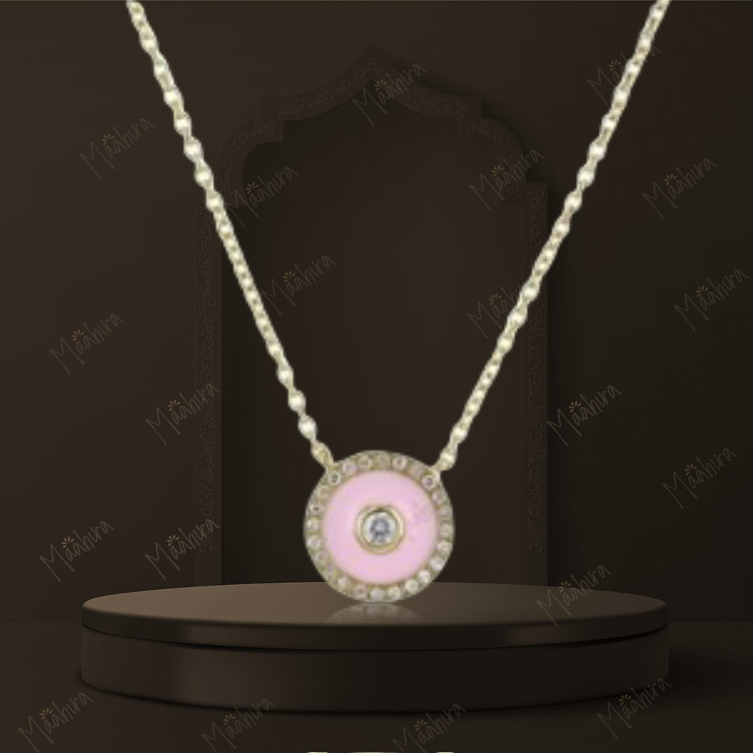 The disc necklace has a baby pink enamel centre with a halo of 0.095 carats of diamonds surrounding it. You can't go wrong with this buy because it is set in 2.045 grams of 14-karat yellow gold and weighs 2.064 grams.