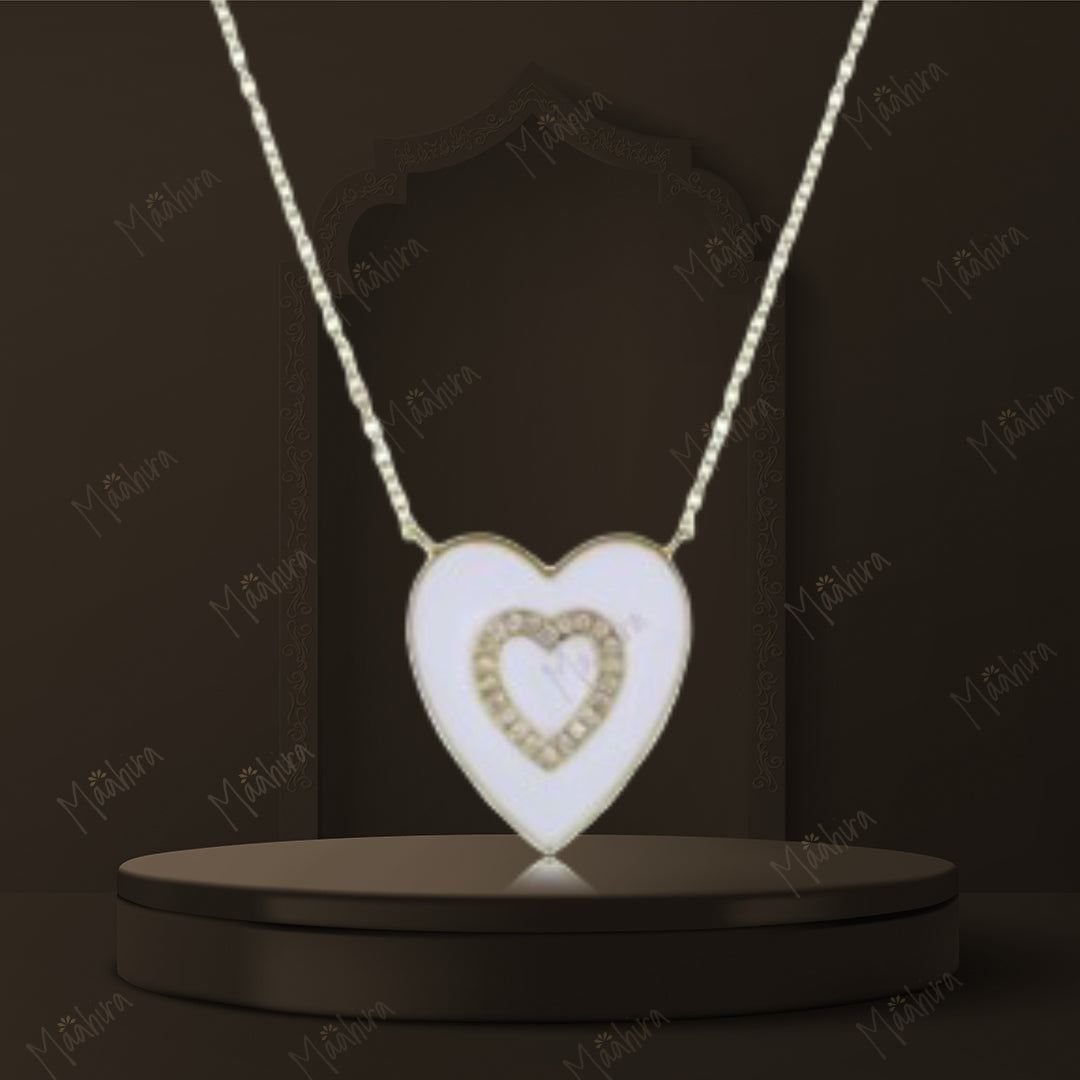 With 0.07 carats of diamonds artfully carving a glittering heart inside a white enamel heart, the neckpiece is stunning. A 3.002gm design is set in 2.988gms of 14K yellow gold.