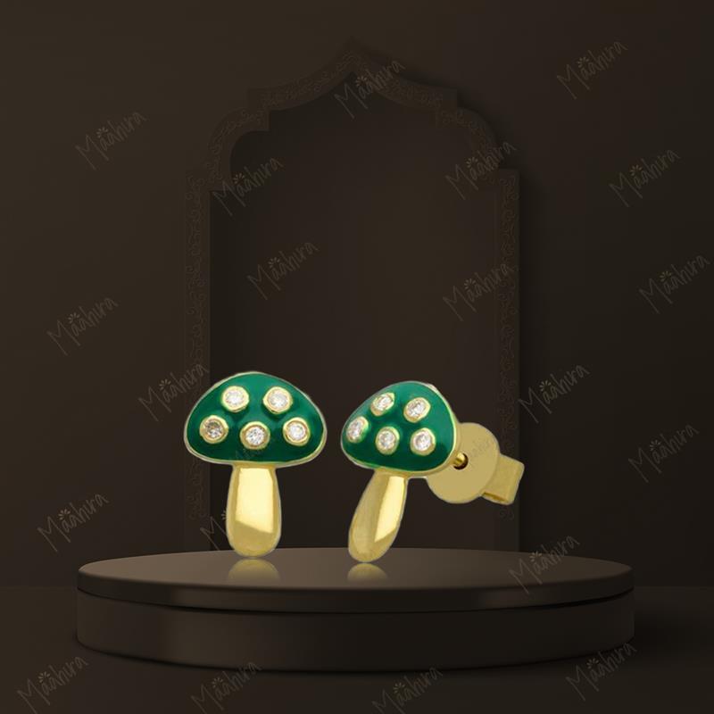 These diamond mushroom studs with green enamel will make you look more charming and attractive, it is fit for any special occasion for party or go out playing. These mushroom studs are made of dimensions 8.50x11.30mm with 0.091carat diamonds and 0.139carat green enamel. It weights 1.989gms and made in 1.943gms of 14k yellow gold total.