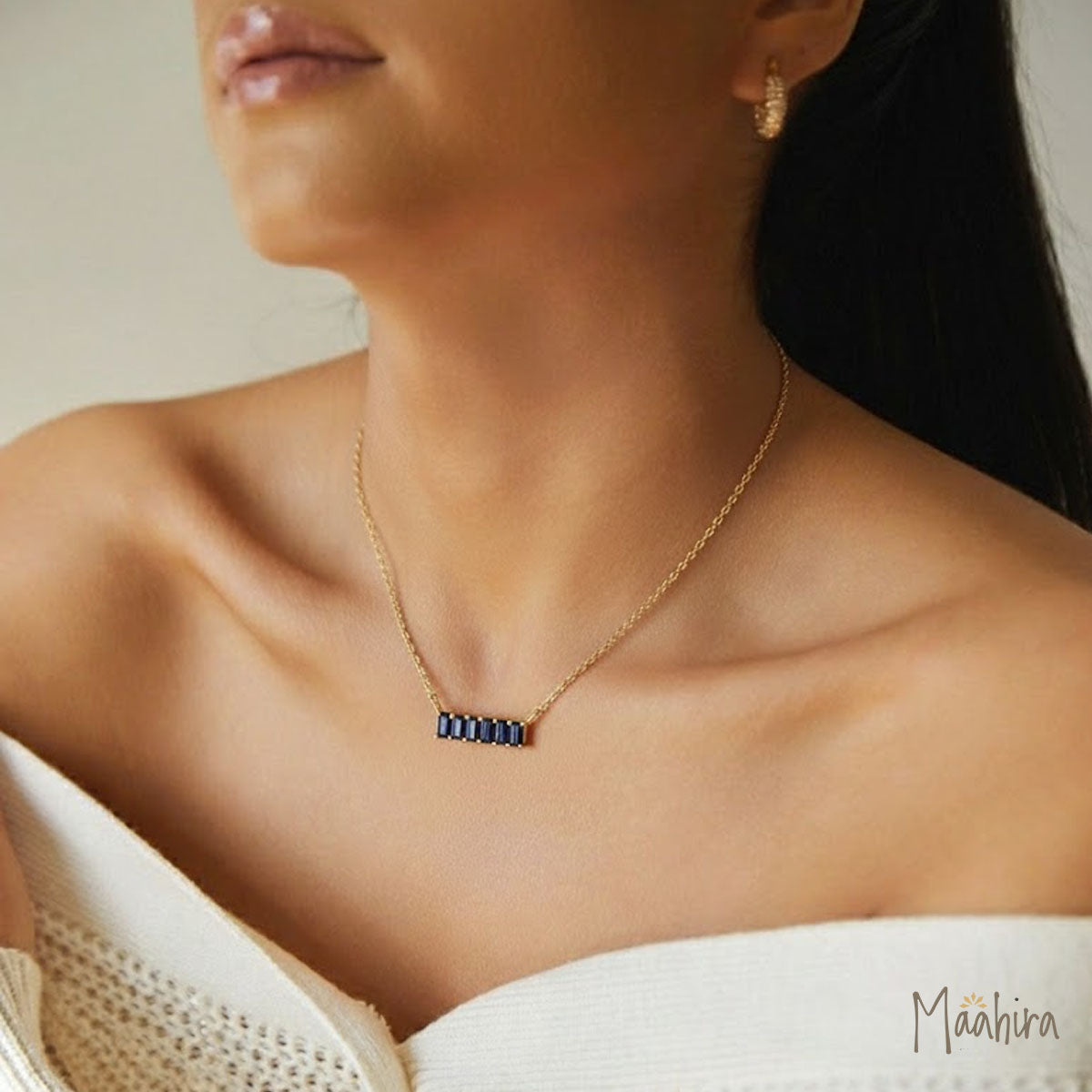 For those who take pleasure in wearing baguette necklaces embellished with blue sapphire. It weighs 1.6 grams and has a 10.20 x 3.20 mm diameter, 1.54 grams of 14k yellow gold, and 0.256 carats of diamond.