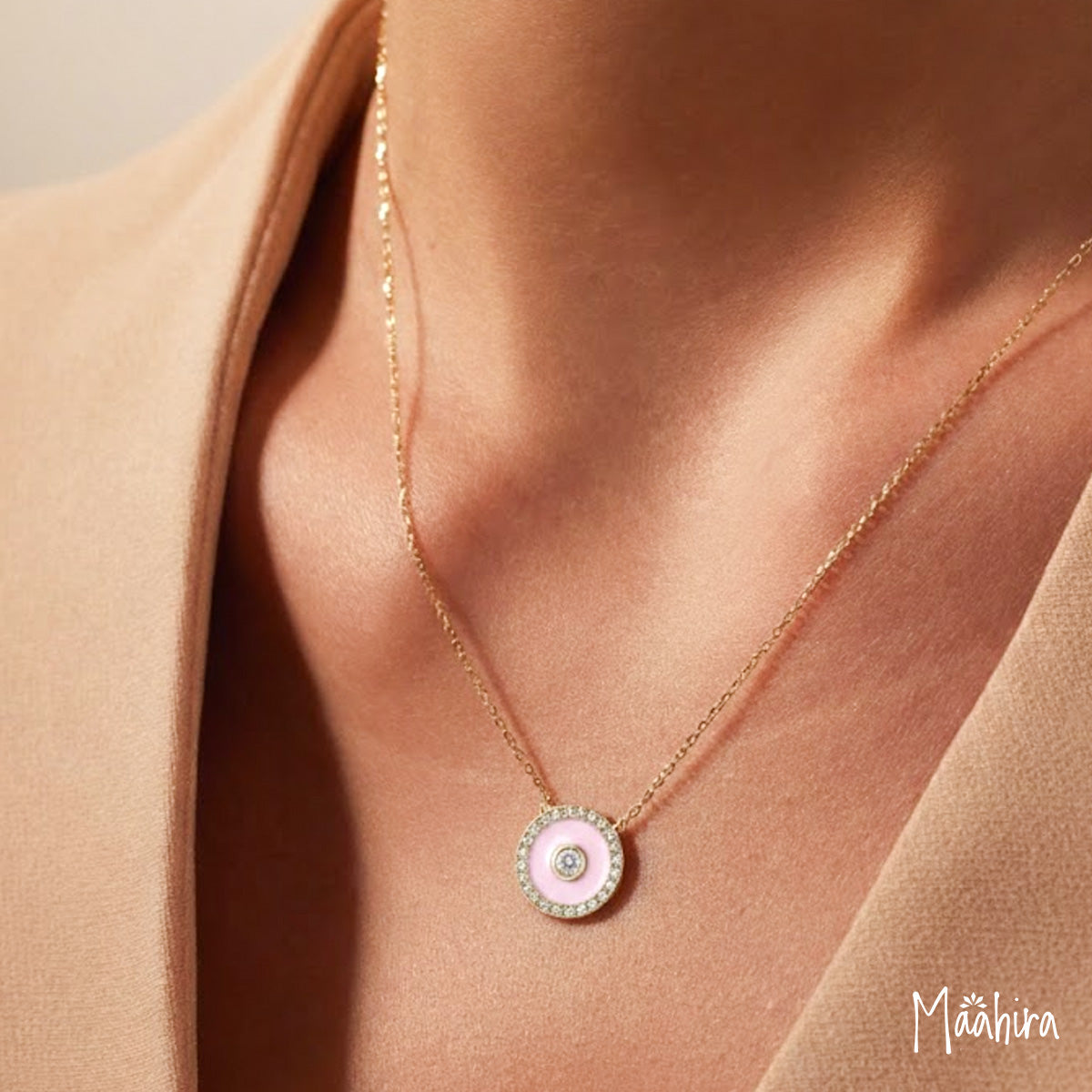 Diamond Pink Enamel Disc Pendant Necklace