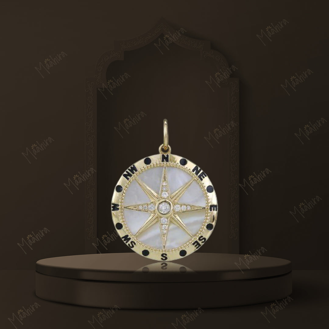 This stunning compass pendant is crafted from 14k yellow gold and it's adding a touch of sparkle to any outfit. Representing the interconnectedness of life and eternity, guidance and protection on life's journey. This diamond mother of pearl star compass pendant with black enamel is made of dimension 21.50mm with 0.133carats of diamond and 8.253carats of mother of pearl. It weighs 5.189gms and crafted in 3.512gms of 14k yellow gold total.